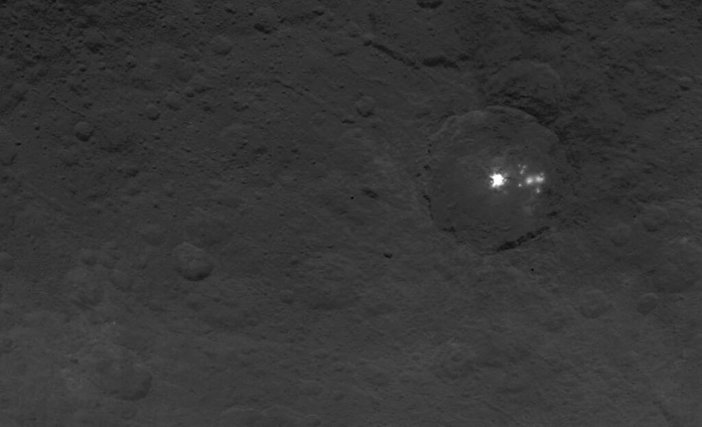 Official NASA Caption: A cluster of mysterious bright spots on dwarf planet Ceres can be seen in this image, taken by NASA’s Dawn spacecraft from an altitude of 2,700 miles (4,400 kilometers).
