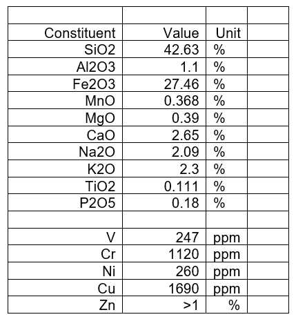 It is our opinion that the closest “man-made” material match to SD’s samples is zinc slag fuming residua. However the presence of a large amount of carbon appears to invalidate this.