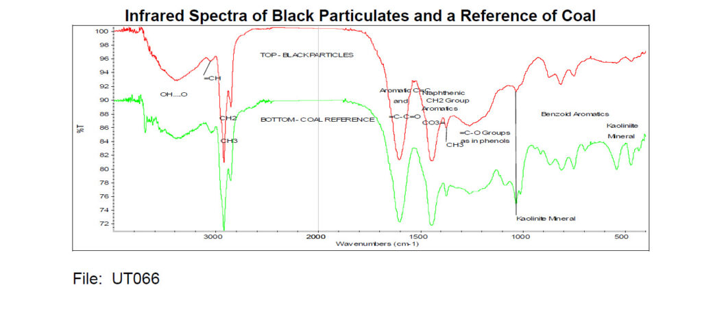 The black particulates are identified as coal. No other materials are detected. This may be native to the area, or transported to the area from another source.