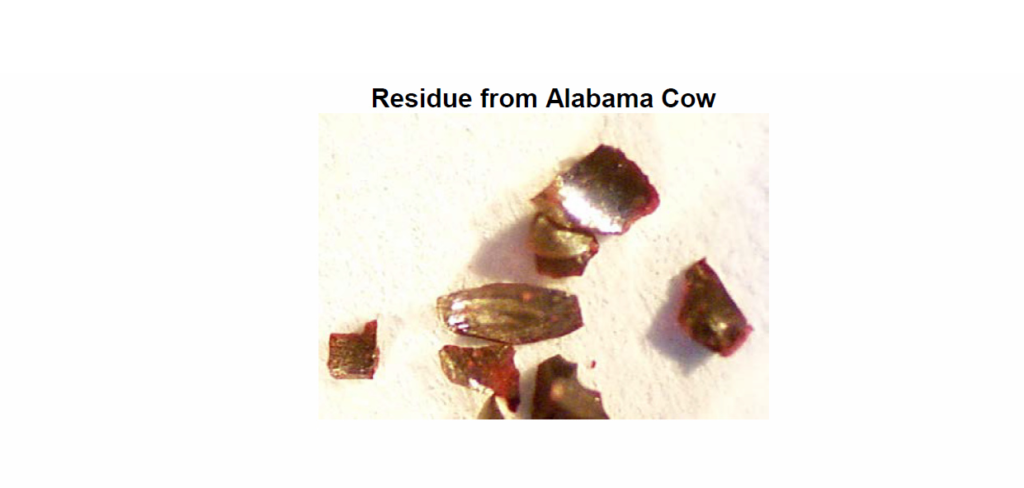 Analyze red-brown particles retrieved from the hide near the anal excision of a mutilated cow. It was purported that the event happened “overnight”, i.e. the cow was found in a grove of trees within 24 hours of the event1. Other information indicated there was some rain before the animal was found. The carcass apparently fell through trees because limbs were down and a 6” tree broken. The body contained no blood, an udder was removed, and there was a “hole” in the belly. Scuffed up areas on the hide indicated that the cow was possibly strapped.