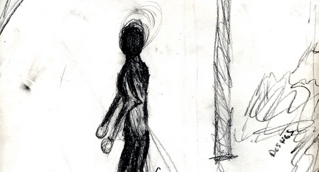 After passing the frail-looking figure,the driver looked into his rear view mirror and again observed – illuminated by the tail lights of his car – what he described as a tall, abnormal figure that moved strangely with pointed joints that “buckled out.” He estimated the figure stood around 6 feet, seven inches.