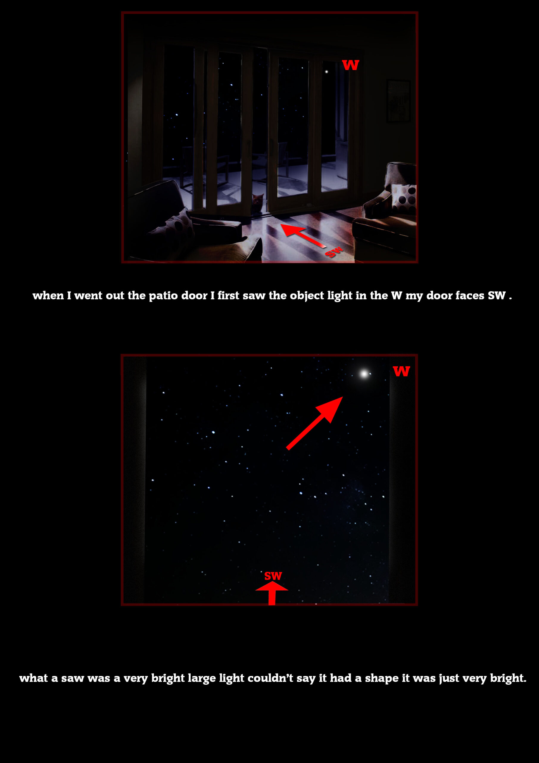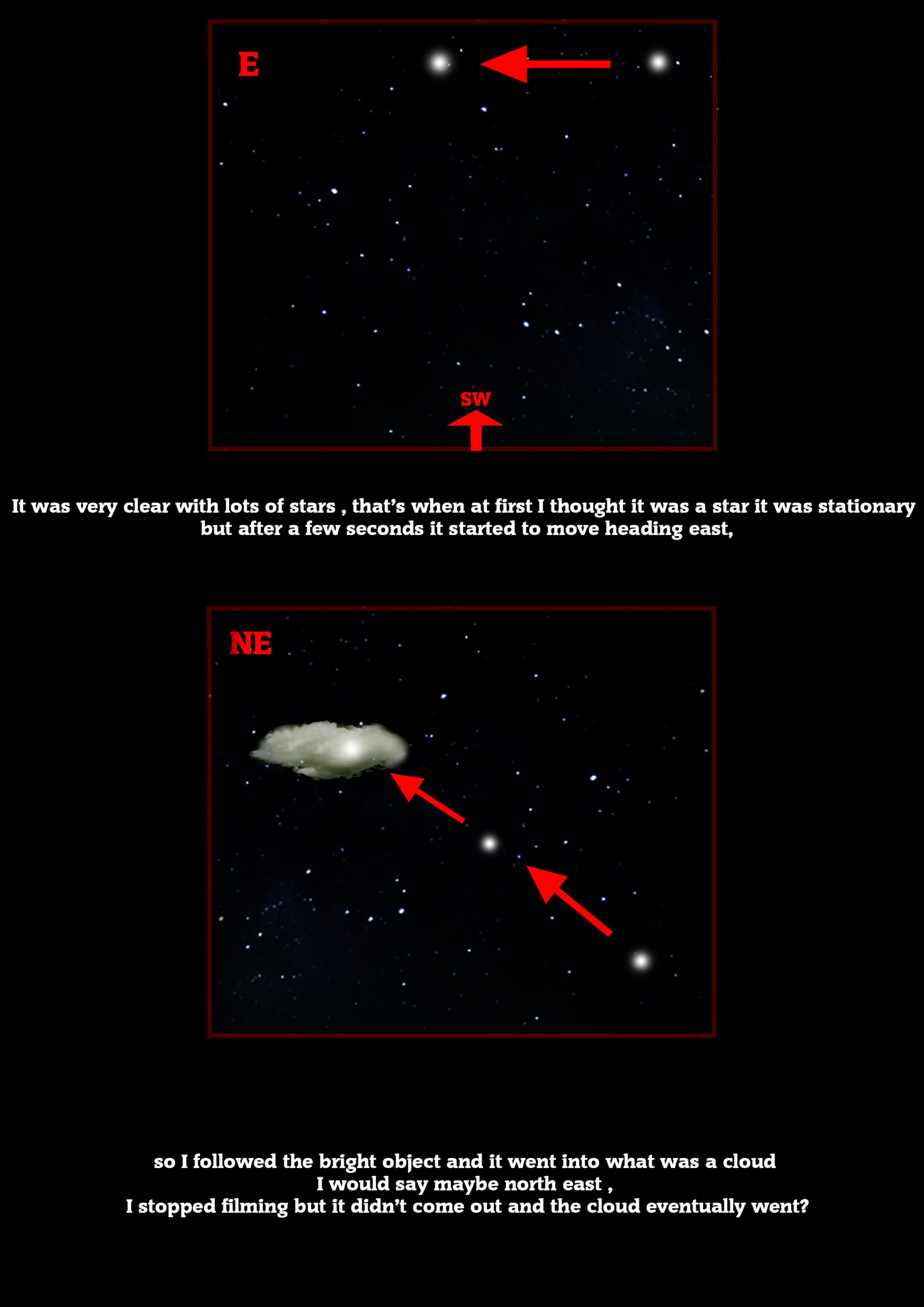 I have created 2 images based on the witness’s testimony, (created using the multiple email replies above) that lead up to the ‘start’ of the video footage recorded by the witness. Please note that the video does not contain stars in contrast to visuals.