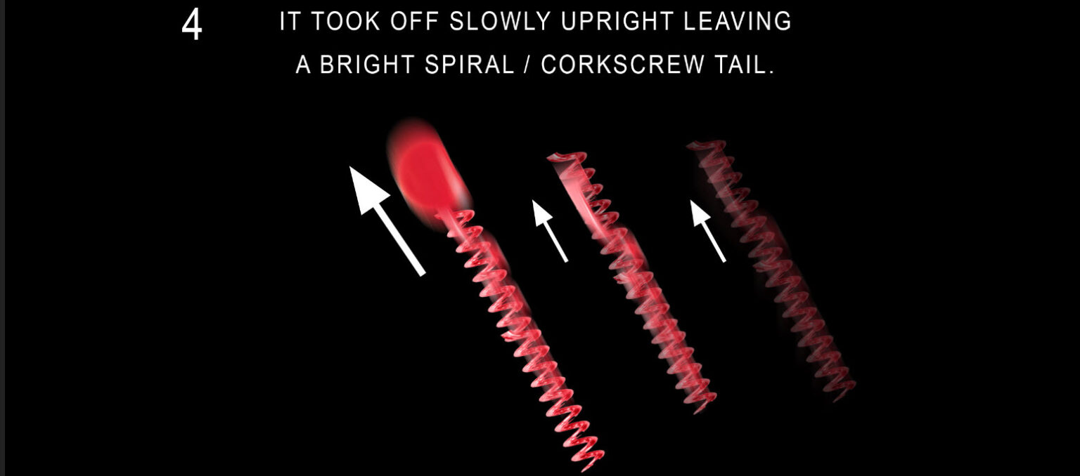 I saw an object as high above the planes as they were above me. It was shaped like a bright red jelly bean. Gently rocking from side to side. It took off slowly upright leaving a bright spiral / corkscrew tail. Then suddenly shot off at an angle, again leaving a red trail and disappeared.