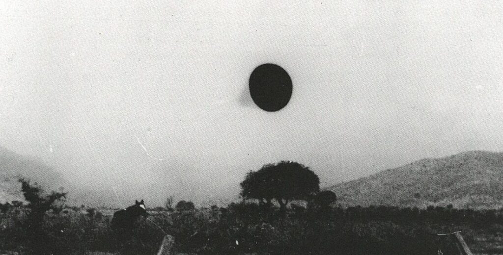 There are two interesting details in the photo which must be emphasized. When Capt. Niotti saw the object, his perception was of a uniform color; thus, he was surprised –after developing the film— that in the photographic image the base of the cone is a dull black, without any gradation of color in spite of being oriented toward the sun, which was hidden by the clouds. The rest of the cone appears much lighter, to the point that it is sometimes difficult to obtain copies showing it clearly, due to the high contrast between the base and the sky background. The edges of the base, in the original negative, appear sharp and well-defined, even more defined that other elements appearing in the photograph. It seems as if the base of the cone were a total sink of radiation, reflecting no light.