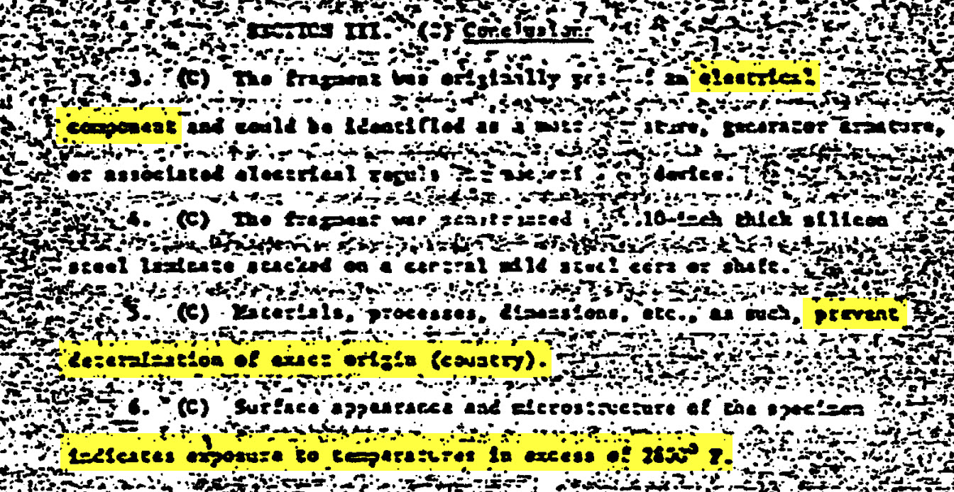 The document states: “The report concludes that the fragment was originally part of an electrical component and was constructed of 0.010-inch thick silicon-steel laminate.” Does this indicate it was manmade? Made from outside Earth? It is unclear.