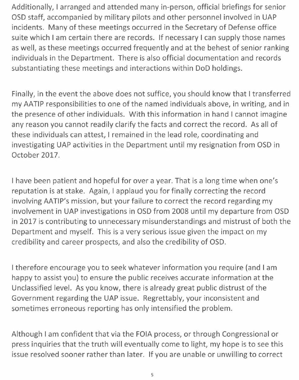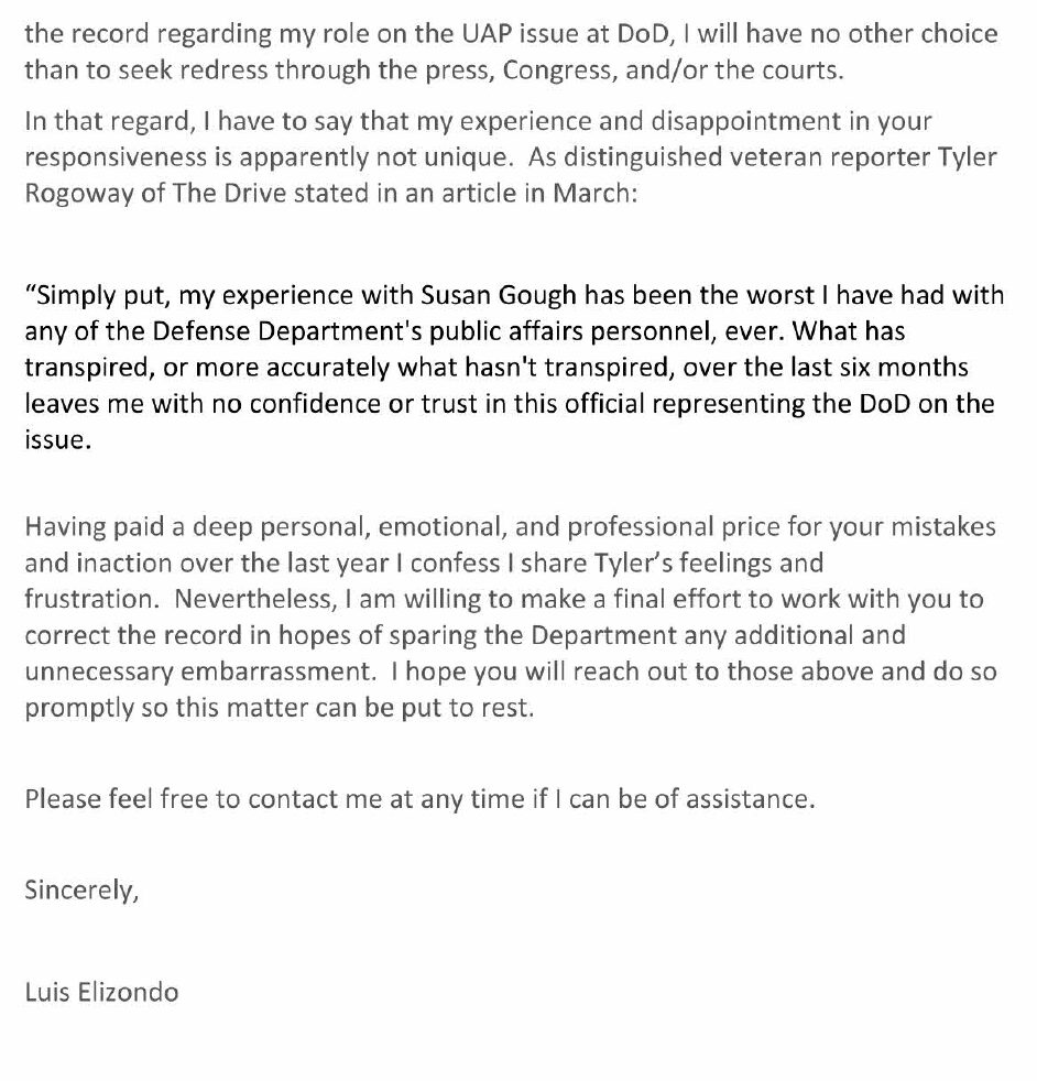 The first letter was sent four days after The Intercept wrote their scathing article about his claims. That e-mail, revealed via a Freedom of Information Act (FOIA) request by The Black Vault (OSD/JS FOIA 21-F-0938), showed that Elizondo sent a letter to the Office of Public Affairs (the identity of the recipient was redacted), as he outlined what he called his “final effort to avoid seeing this unfortunate situation escalate.”