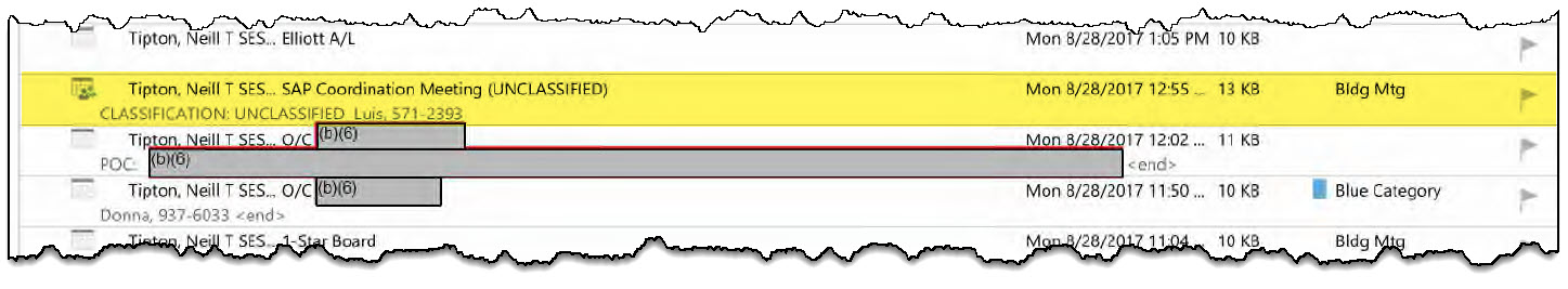 But additional context to this meeting may emerge from email exchanges between Tipton and Elizondo, as published in Elizondo’s DoD/IG complaint. These messages, dated August 22–25, 2017, fall just days before the August 28 calendar entry and depict active communication about a planned meeting, efforts to schedule it, and discussions of an unspecified portfolio Elizondo described as “nuanced.”