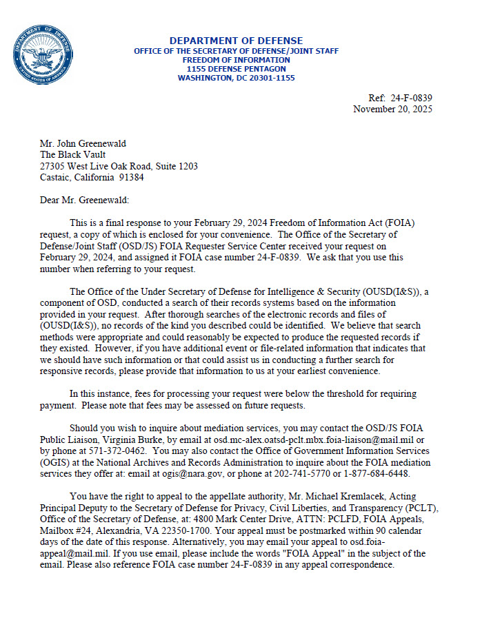 OSD’s “no records” determination, issued today to The Black Vault under FOIA case 24-F-0839, asserts that a search of OUSD(I&S) systems “could reasonably be expected to produce the requested records if they existed,” but that none were identified when it came to seeking out records relating to the meeting.
