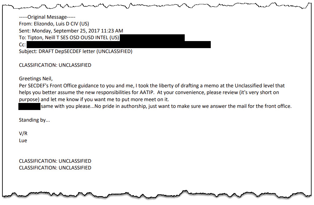 Elizondo wrote that the memo had been drafted “per SECDEF’s Front Office guidance to you and me,” and asked Tipton for edits. Tipton replied on October 3, 2017, saying he would review and provide comments.