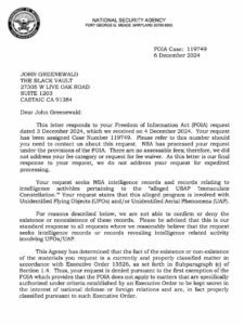 In December 2024, The Black Vault received a response from the National Security Agency to a FOIA request seeking records related to the “alleged USAP ‘Immaculate Constellation.’” Rather than asserting that no search was necessary, the NSA issued a Glomar response, stating it could neither confirm nor deny the existence of responsive records.