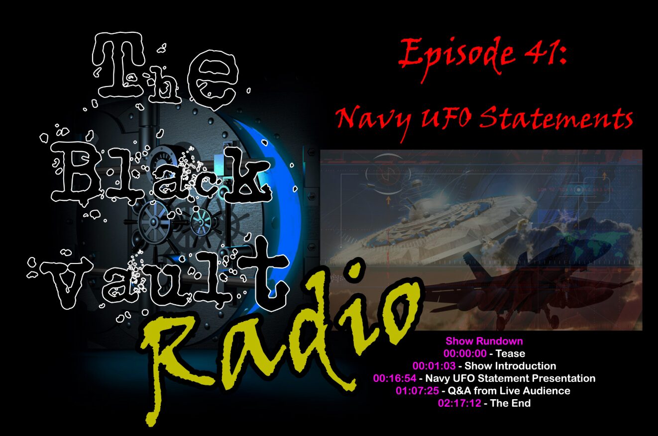 In Episode #41 of The Black Vault Radio, join me, John Greenewald, Jr., as I dissect the string of official statements on UFOs / UAPs as issued by the U.S. Navy to The Black Vault. These are the statements that has caused a flurry of worldwide attention in the past weeks. I will go over each one, word for word, so you can see exactly what the U.S. Navy has said, and we will go over what it may, or may not, mean.