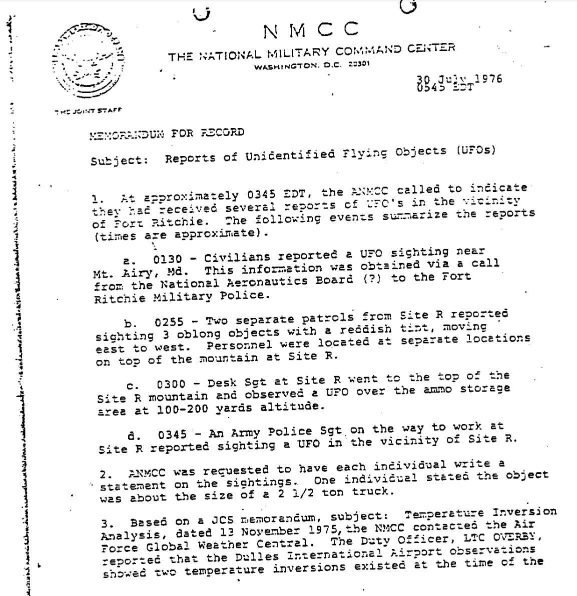 The documents depict multiple UFOs being seen over Mt. Airy, Maryland, which were reported to the Fort Richie Military Police. In addition, two different patrols at a facility known as Site R, also known as the Raven Rock Mountain Complex. Site R is also known as the “underground Pentagon,” and considered a highly sensitive area. Two patrols saw three oblong objects over the complex. A desk sergeant also saw a UFO over the ammo storage area about 100-200 yards over it. Another Army police sergeant also saw a UFO in the vicinity of Site R while on their drive to work.
