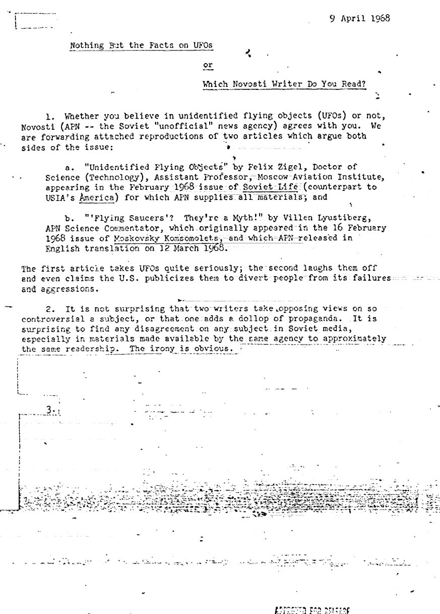 The majority of this document is publicly available / sourced material, from two entities of the Soviet era Novosti / APN news outlet. One was published in Soviet Life in 1968, while the other was published in Moskovsky Komsomolets that same year. Both had different takes on the UFO issue, and both were circulated internally at the CIA.